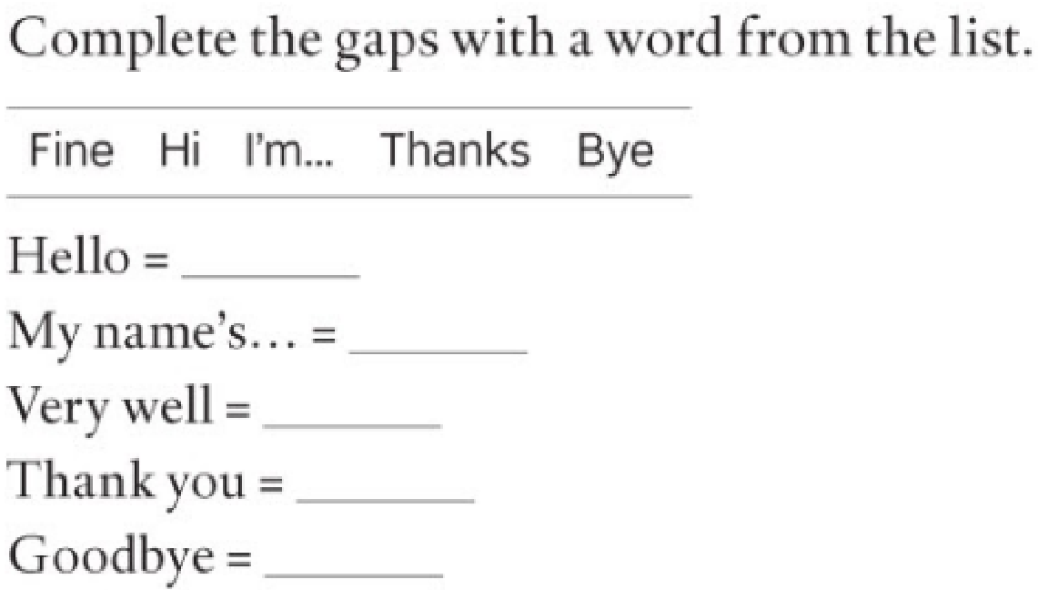 Vocabulary Lesson 1 In this lesson, we will talk about greetings and saying goodbye. Please open Page 4, ex 1. Fill in the gaps.